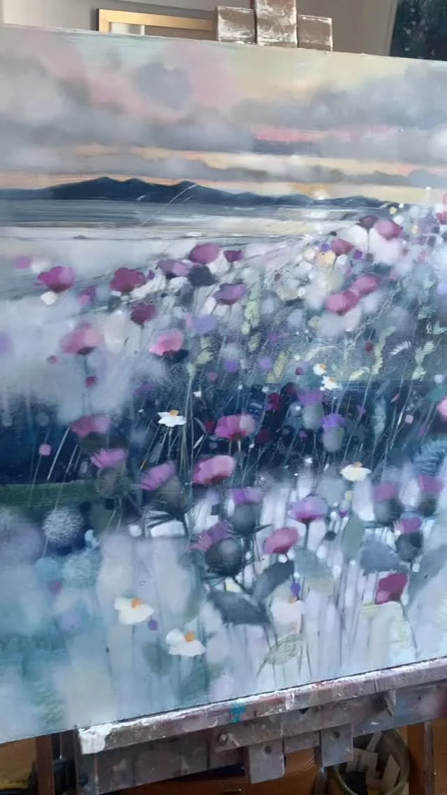 36cm × 18cm (14” x 7”) Small painting presented in a handmade white woodgrain frame (Moulding for frame is 2.2cm x 2.2cm) and off white mount with glass. The frame is outside frame size 53cm × 36cm (21” x 14”).